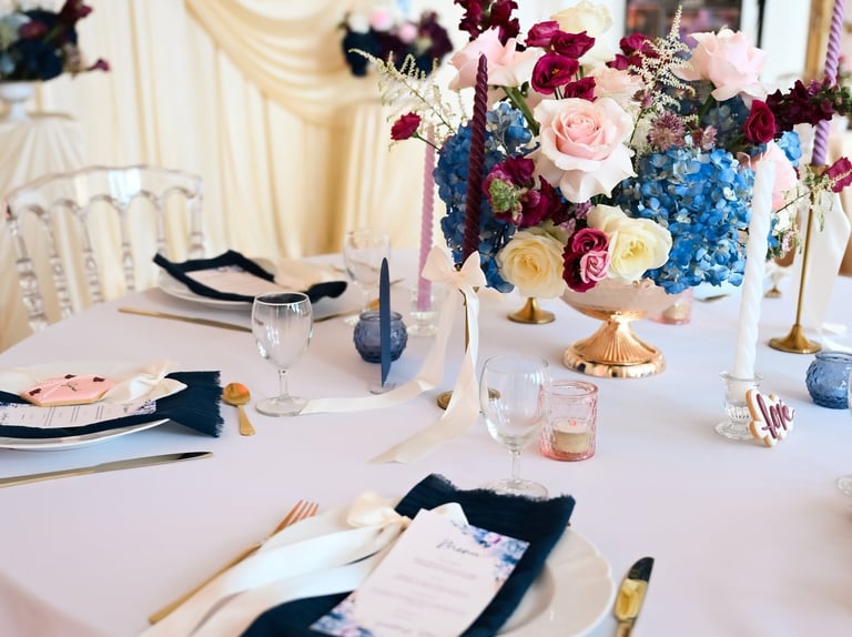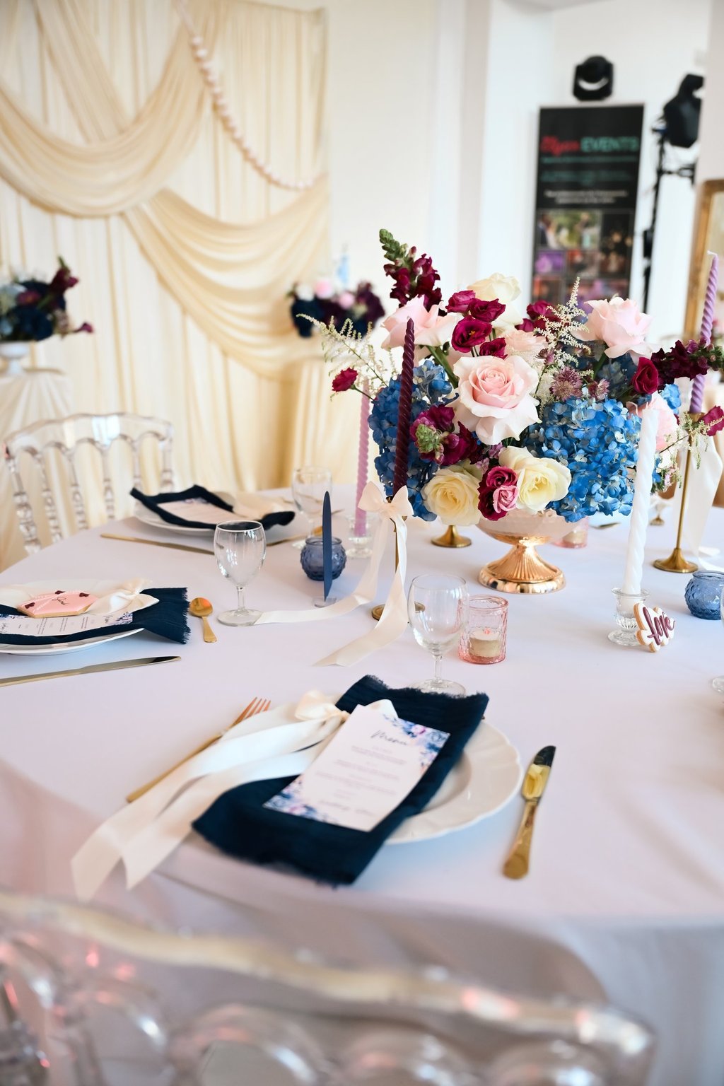 Une table décoré avec soin: de la jolie vaisselle, des bougies, de belles compositions florales, et cadeaux invités.